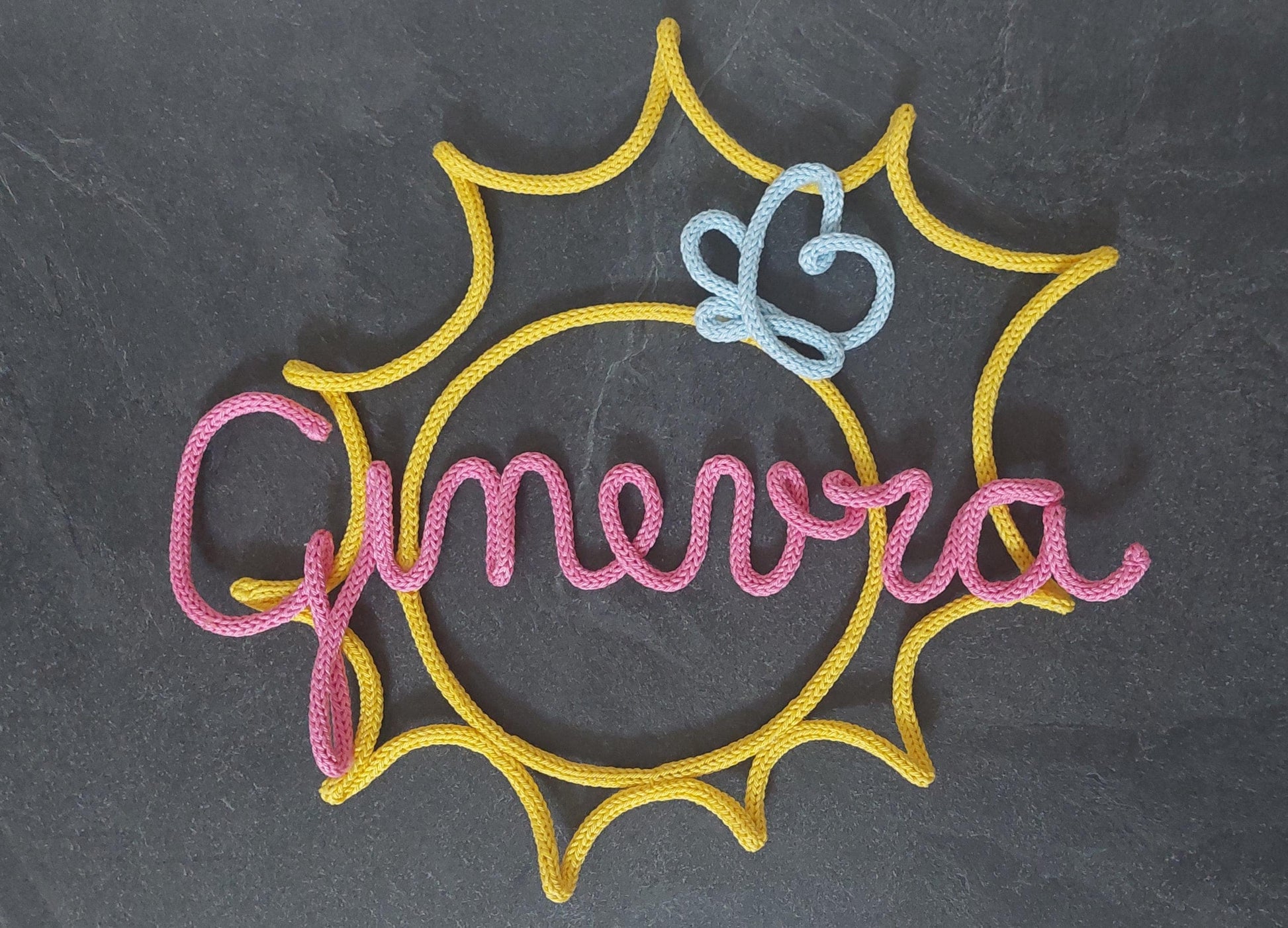 ✨️ Fiocco nascita e decorazione perfetta per la cameretta del tuo bimbo o bimba, realizzata interamente a mano con filo intrecciato modellato su struttura in ferro. Il design presenta un sole radioso di colore giallo, con il nome personalizzato intrecciato al centro e una dolce farfallina decorativa.