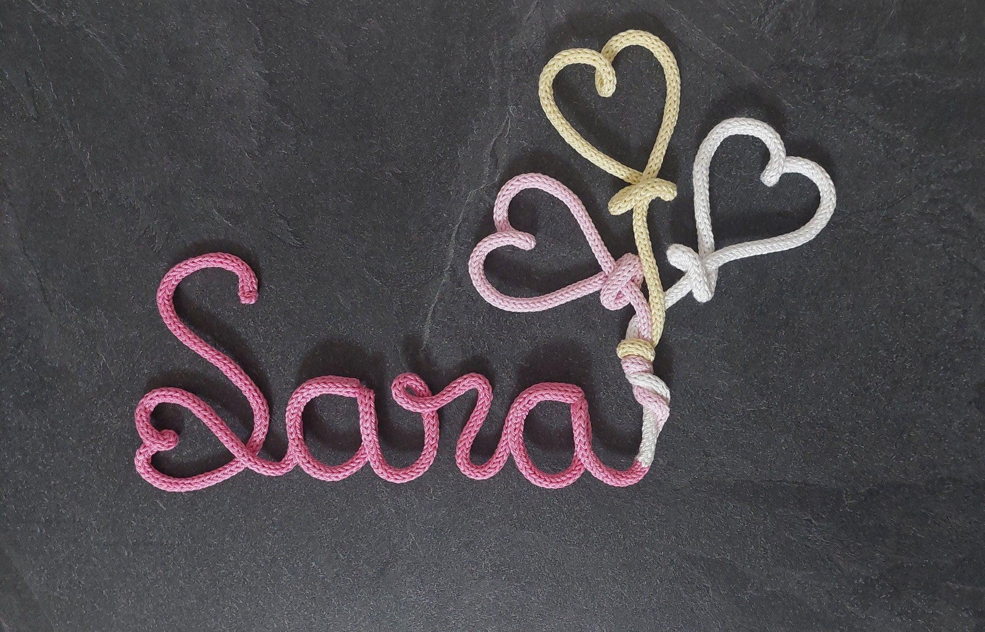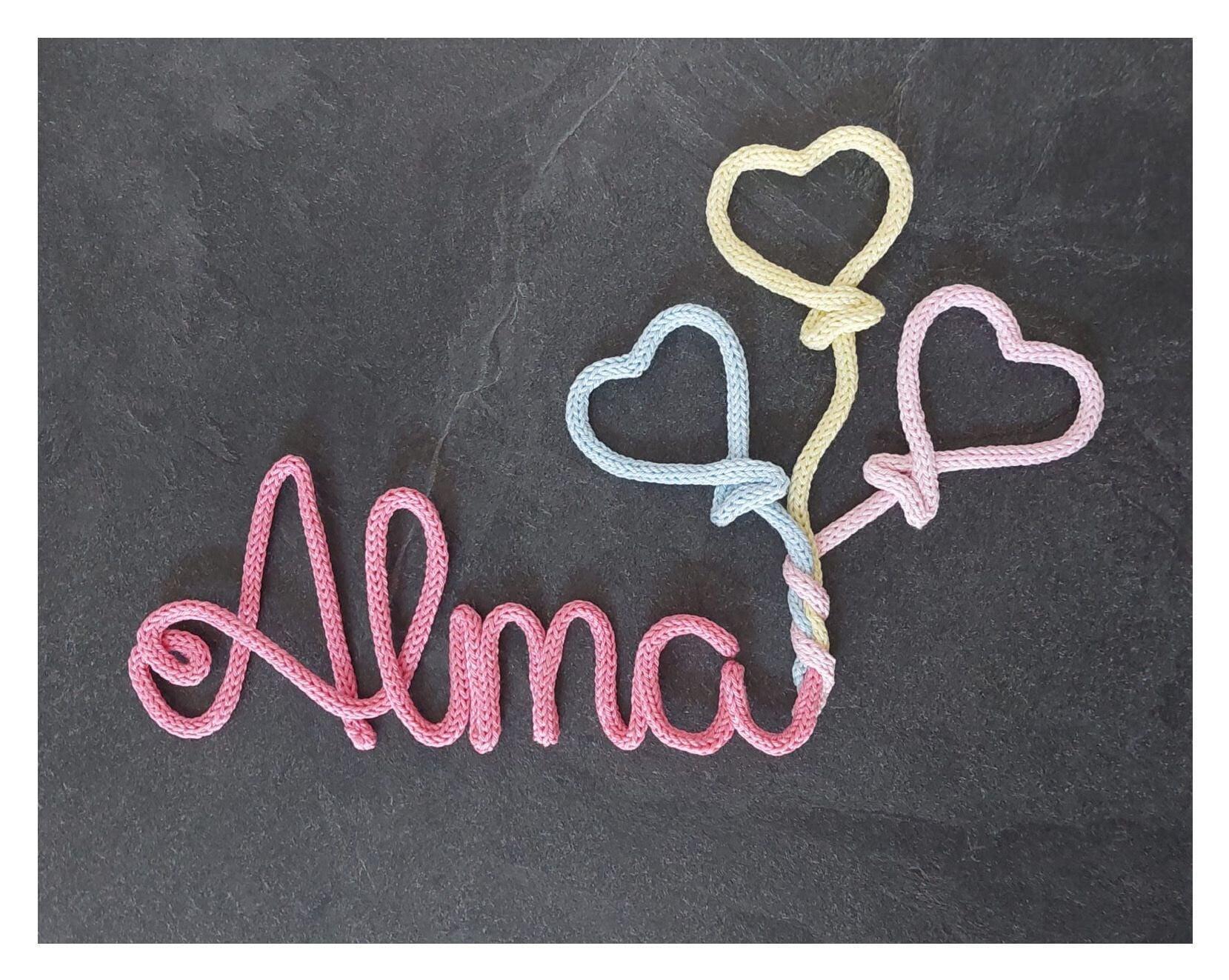 Fiocco nascita personalizzato con nome in tricotin e cuori Decorazione cameretta neonato Regalo nascita originale Handmade